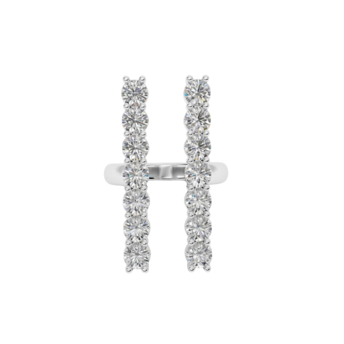A striking silver ring featuring two vertical rows of brilliant diamonds that create a bold and elegant statement.